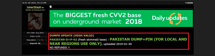 The second database was put up on Joker’s Stash on January 30th. The «PAKISTAN-D+P-02» set, comprised of the details of 67,654 cards of Pakistani banks was significantly larger. The sellers marked the set as «high valid» and, unlike the first set, advertised the database on all major underground forums such as («Omerta», «Crdclub», «Enclave» etc.). 96% of all cards in the set were also related to Meezan Bank Ltd.