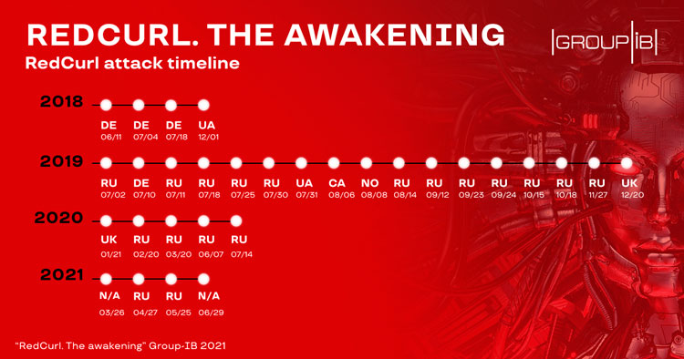 Last year, in the report “RedCurl. The pentest you didn’t know about” Group-IB researchers described for the first time a new Russian-speaking hacker group that they had codenamed RedCurl. Between 2018 and 2020, the threat actor carried out at least 26 attacks. Group-IB identified 14 victim organizations across various countries and industries. Victims included companies in the fields of construction, finance, consulting, retail, insurance, and law located in the UK, Germany, Canada, Norway, Russia, and Ukraine. Seven months later, in 2021, RedСurl attacks resumed.