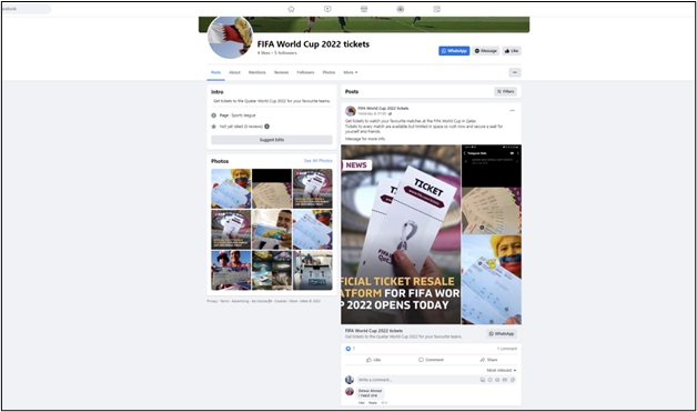Scammers also targeted those looking to purchase tickets for the games at the FIFA World Cup 2022. To make this discovery, Group-IB tracked 5 websites and more than 50 social media accounts registered no earlier than September 2022 containing mentions of “FIFA”, “World Cup” and “tickets.”