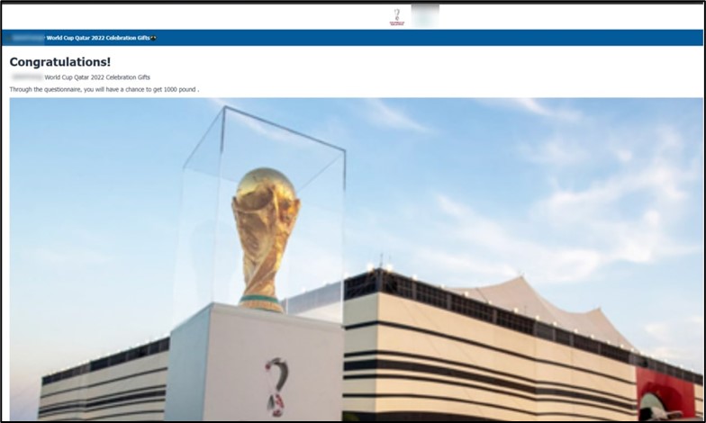 In another scam scheme, threat actors leveraged not only the likeness of the FIFA World Cup 2022 in Qatar, as a leading Qatari petrochemical company was also impersonated. In total, Group-IB identified and analyzed more than 16,000 fake surveys impersonating several large brands, including thousands that used the branding of the FIFA World Cup in Qatar. In this instance, the scammers created fake forms promising those who complete the survey a FIFA World Cup celebration gift from the petrochemical company as a ploy to steal personal data from potential victims.