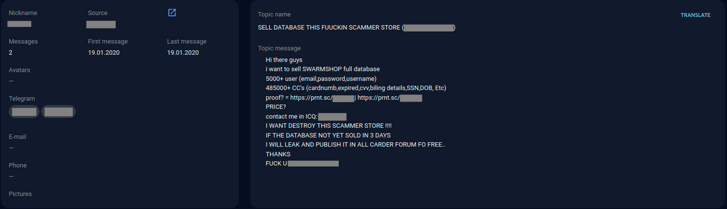 Interestingly, it is not the first time Swarmshop has been targeted by fellow cybercriminals. In January 2020, the cardshop’s records were leaked on an underground forum. The user, likely motivated by revenge, wanted to sell the Swarmshop user database and posted a screenshot allegedly from the cardshop’s admin panel.