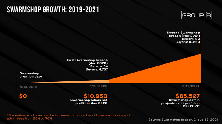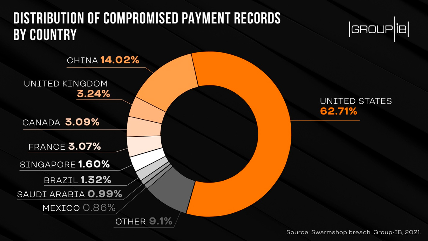 Group-IB, a global threat hunting and adversary-centric cyber intelligence company, discovered that user data of the Swarmshop card shop have been leaked online on March 17, 2021. The database was posted on a different underground forum and contained 12,344 records of the card shop admins, sellers and buyers including their nicknames, hashed passwords, contact details, history of activity, and current balance. In addition to user data, the database exposed all compromised data traded on the website, including 623,036 payment card records issued by the banks from the USA, Canada, the UK, China, Singapore, France, Brazil, Saudi Arabia, Mexico; 498 sets of online banking account credentials and 69,592 sets of US Social Security Numbers and Canadian Social Insurance Numbers. Group-IB notified the national CERTs in the above-mentioned countries about the breach so they could take the necessary steps to mitigate the threat.