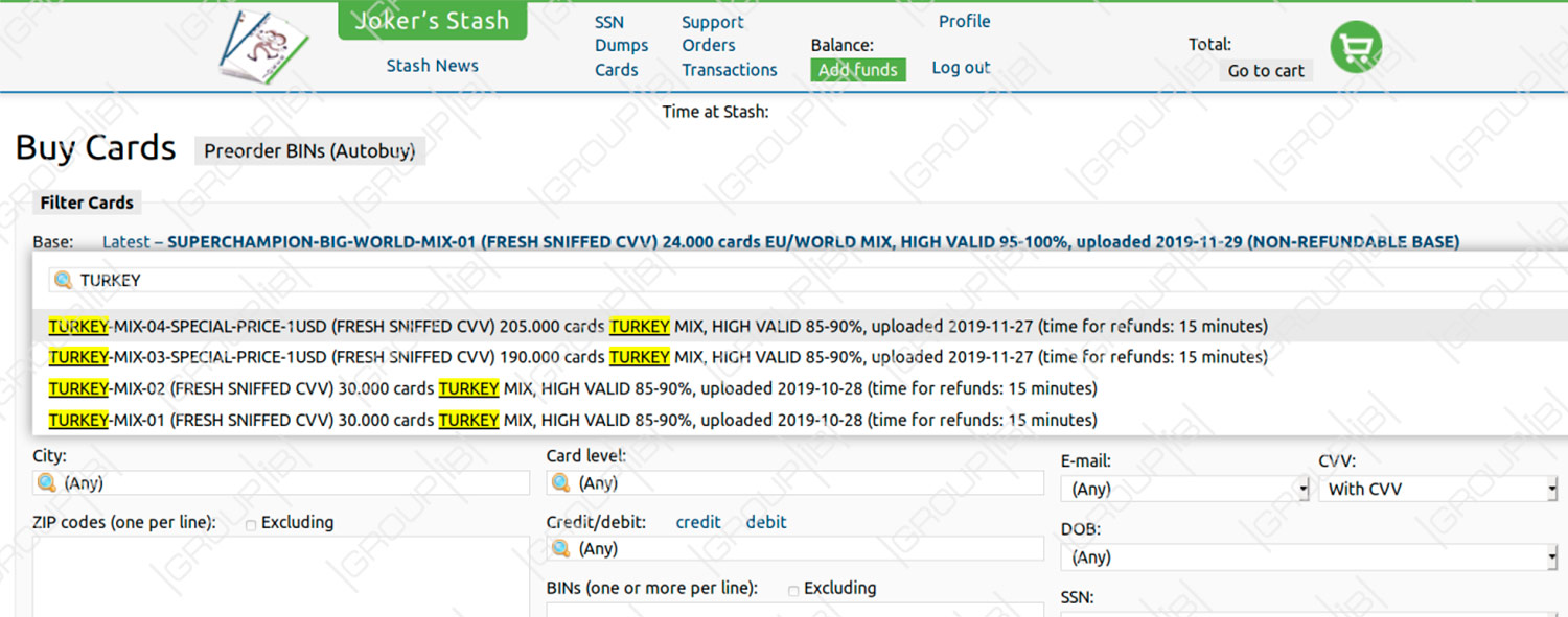 Using its own unique tools for underground forums and cardshops monitoring, research and analysis Group-IB Threat Intelligence team has discovered that compromised payment records predominantly related to TOP 10 Turkish banks were uploaded in four parts to Joker’s Stash one of the most popular underground cardshops. The first two databases named «TURKEY-MIX-01 (FRESH SNIFFED CVV) 30.000 cards TURKEY MIX, HIGH VALID 85-90%, uploaded 2019-10-28 (NON-REFUNDABLE BASE)» and «TURKEY-MIX-02 (FRESH SNIFFED CVV) 30.000 cards TURKEY MIX, HIGH VALID 85-90%, uploaded 2019-10-28 (NON-REFUNDABLE BASE)» went on sale on 28.10.2019 and had 60,000 pcs. All the cards in these two parts were sold at 3$ each.