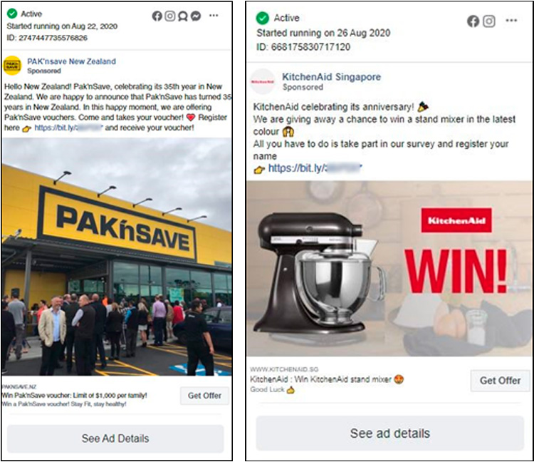 COVID-19 has given rise to digital crime of all kinds. On October 20, Singapore police alerted the public of a new variant of phishing scam leveraging fake advertisement campaigns and lucky draws from banks. Not only public and private companies embraced the transformations brought about by the pandemic, but also fraudsters who see opportunities to deceive users. A recent survey suggested searches for cooking-related keywords and kitchen-related appliances increased before and during the circuit breaker in Singapore. As such, Group-IB researchers identified at least 150 non-official Facebook brand pages for KitchenAid alone. Other than KitchenAid, another 86 brands such as KFC and IKEA were similarly affected with fake pages pretending to be them. Fraudsters use fake Facebook brand pages to launch massive ad campaigns on social media leveraging built-in tools targeting wider audience.