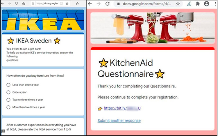The ads resemble normal Facebook promotional posts, using the same creatives as legitimate brands do. Such posts prompt users to follow a unique bit.ly link in order to win a prize. However, instead of a fraudulent link, as it was with Lotsy scheme previously, the ad links to a survey on Google Forms page that asks simple questions about the brand. Using multiple Google forms helps to look harmless for automated brand monitoring systems, especially since the questions asked are simply about customer experience using a particular brand.