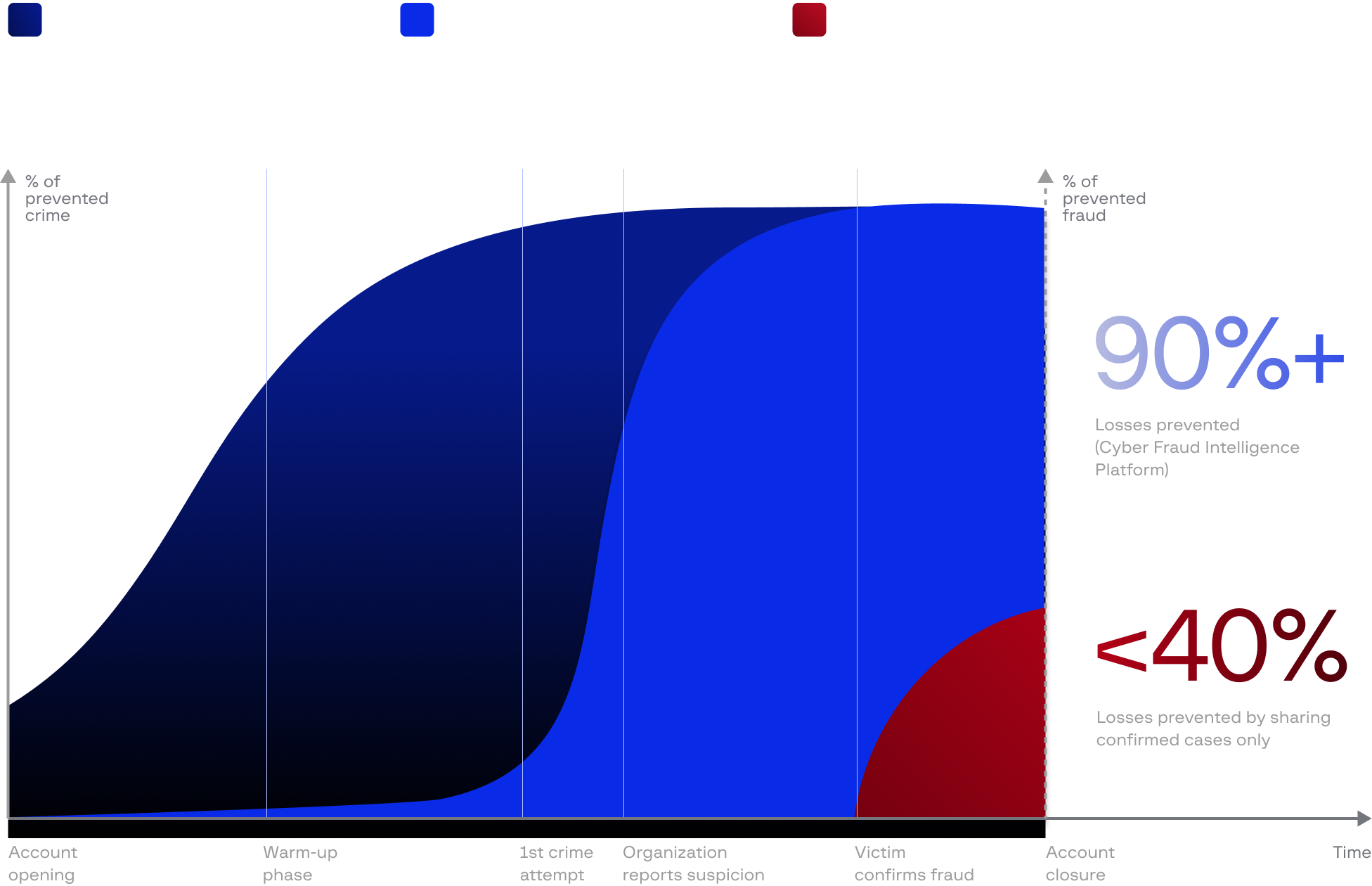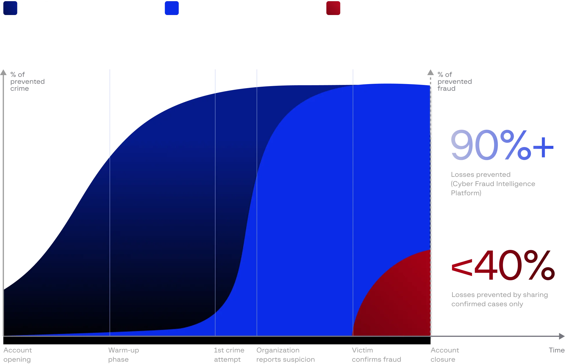 A typical fraud lifecycle involves a 4–8 week warm-up phase before rapid execution. While privacy rules delay traditional sharing until after losses, Cyber Fraud Intelligence Platform detects suspicious activity during this warm-up period, enabling proactive blocking before fraud happens.