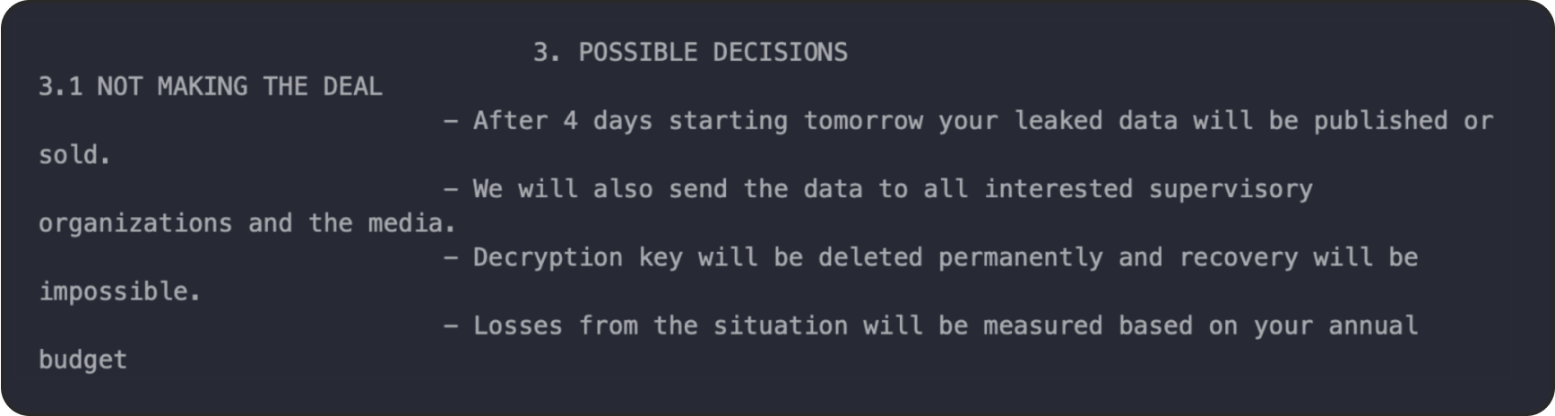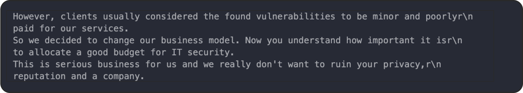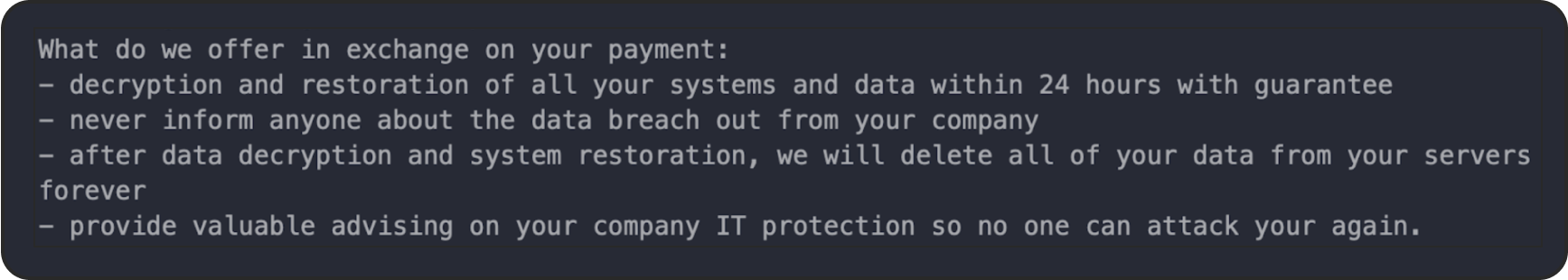 Ransomware groups now often provide personalized and negotiable ransom demands. They also often use a polite and conversational tone to engage victims in negotiations. This specific approach, combined with friendly or even apologetic language, is part of a broader trend where ransomware groups try to come across as more professional and cooperative. By doing so, they are trying to lower the victim’s defenses and prompt quicker payment.