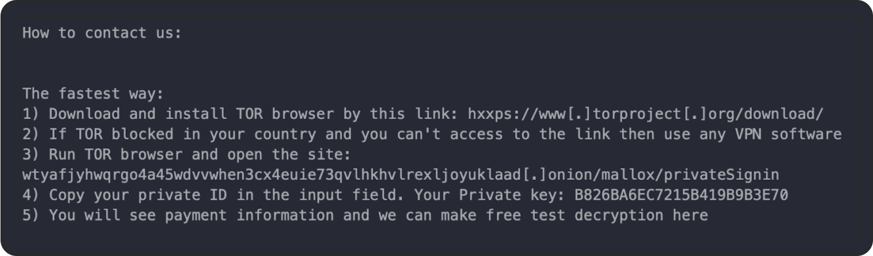 Ransom notes more and more often include detailed, step-by-step instructions for victims on how to access dark web links via Tor and how to purchase cryptocurrency to pay the ransom. Mallox exemplifies this trend: it provides clear guidance to ensure that victims are able to complete the transaction smoothly and easily. This “user-friendly” approach minimizes friction in the payment process, increasing the likelihood that victims will comply.