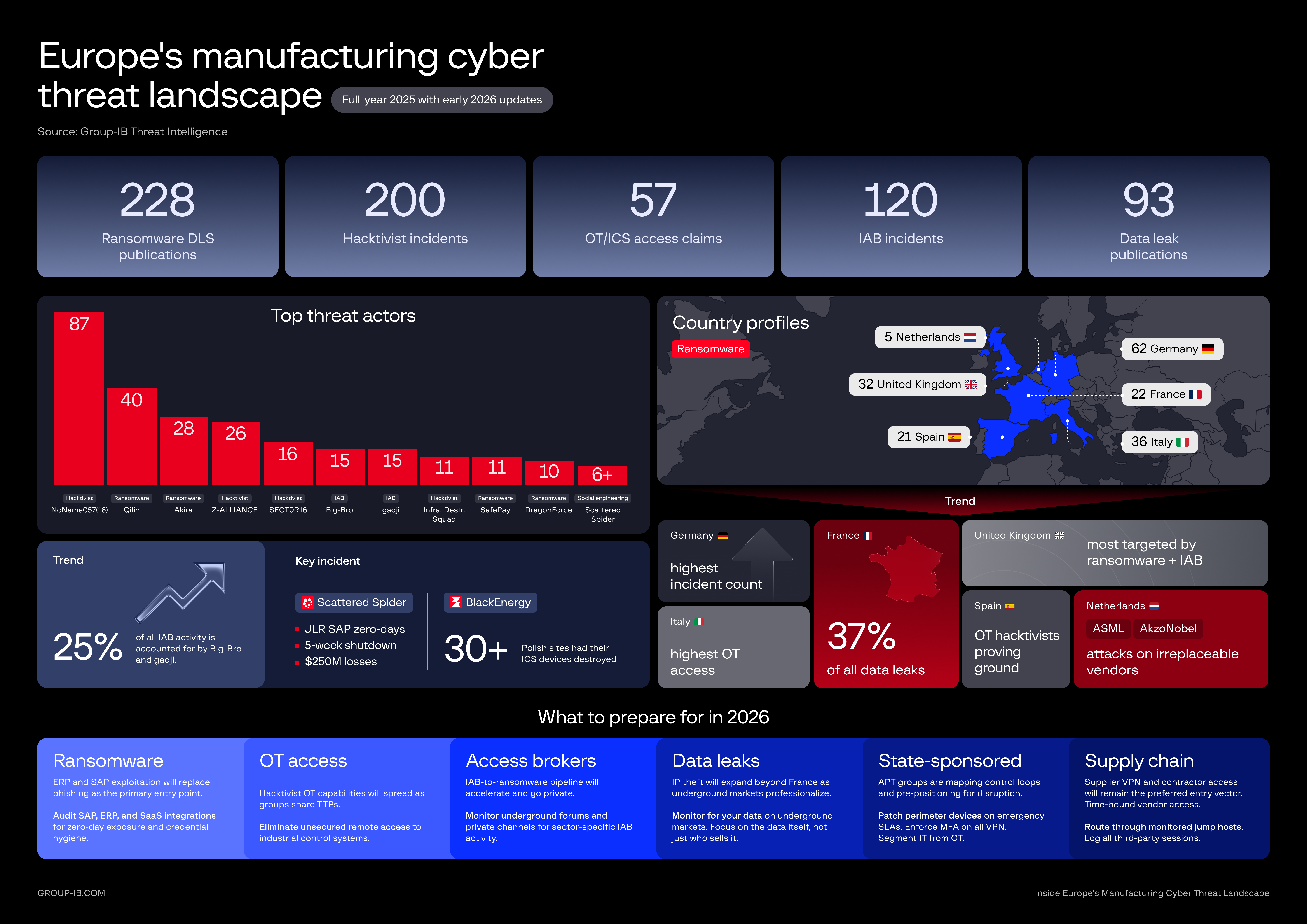 All data is sourced from Group-IB Threat Intelligence, which provides continuous visibility into underground forums, dark web marketplaces, ransomware affiliate channels, hacktivist communities, and state-sponsored threat activity targeting industrial organizations.