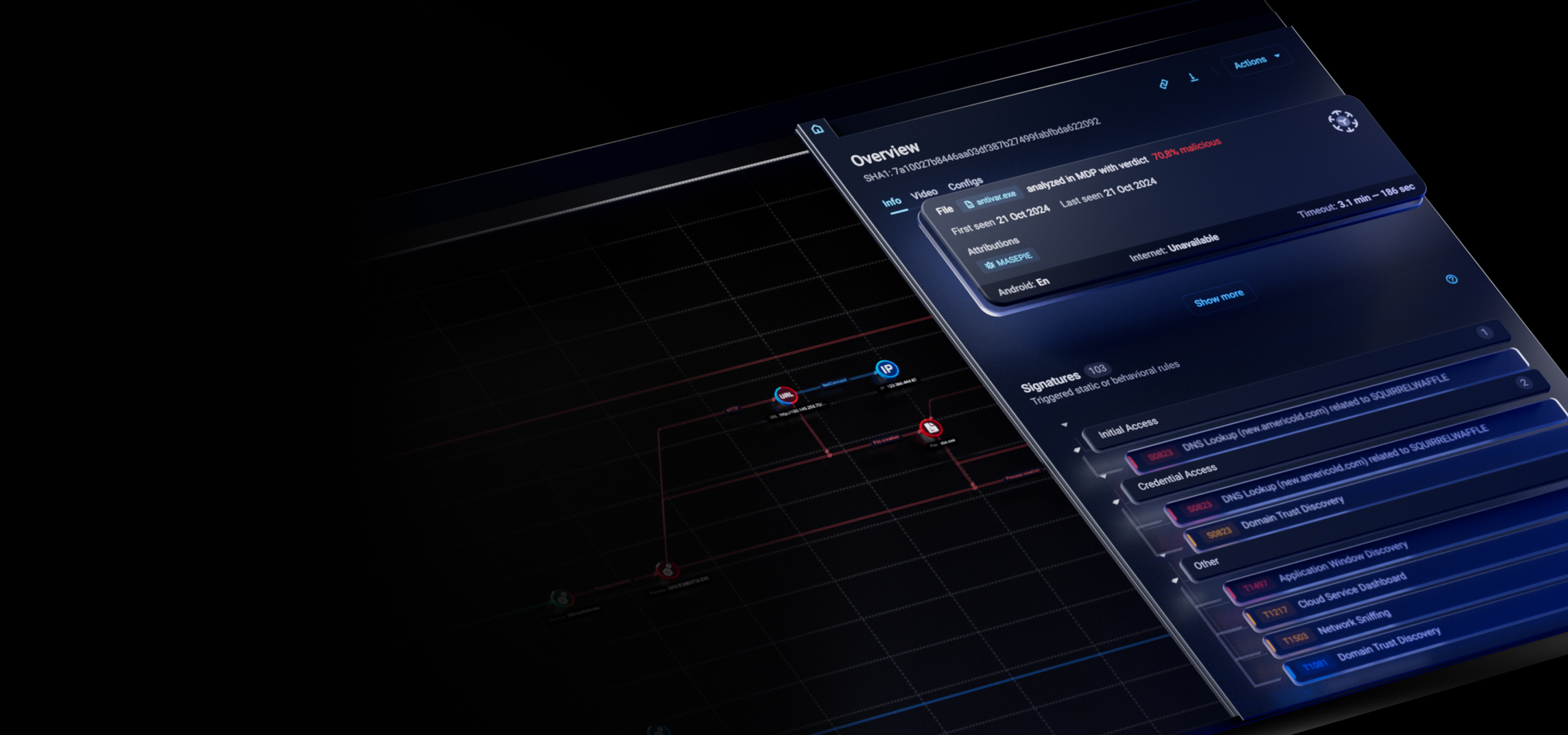 Move away from traditional sandboxes. Access more than 2 million malware reports dissected by Group-IB’s Malware Detonation Platform and gain unparalleled insights into how malware behaves and evolves and how it threatens your organization