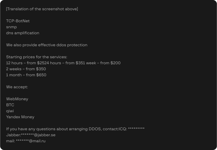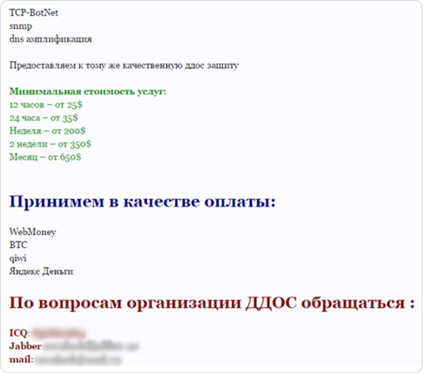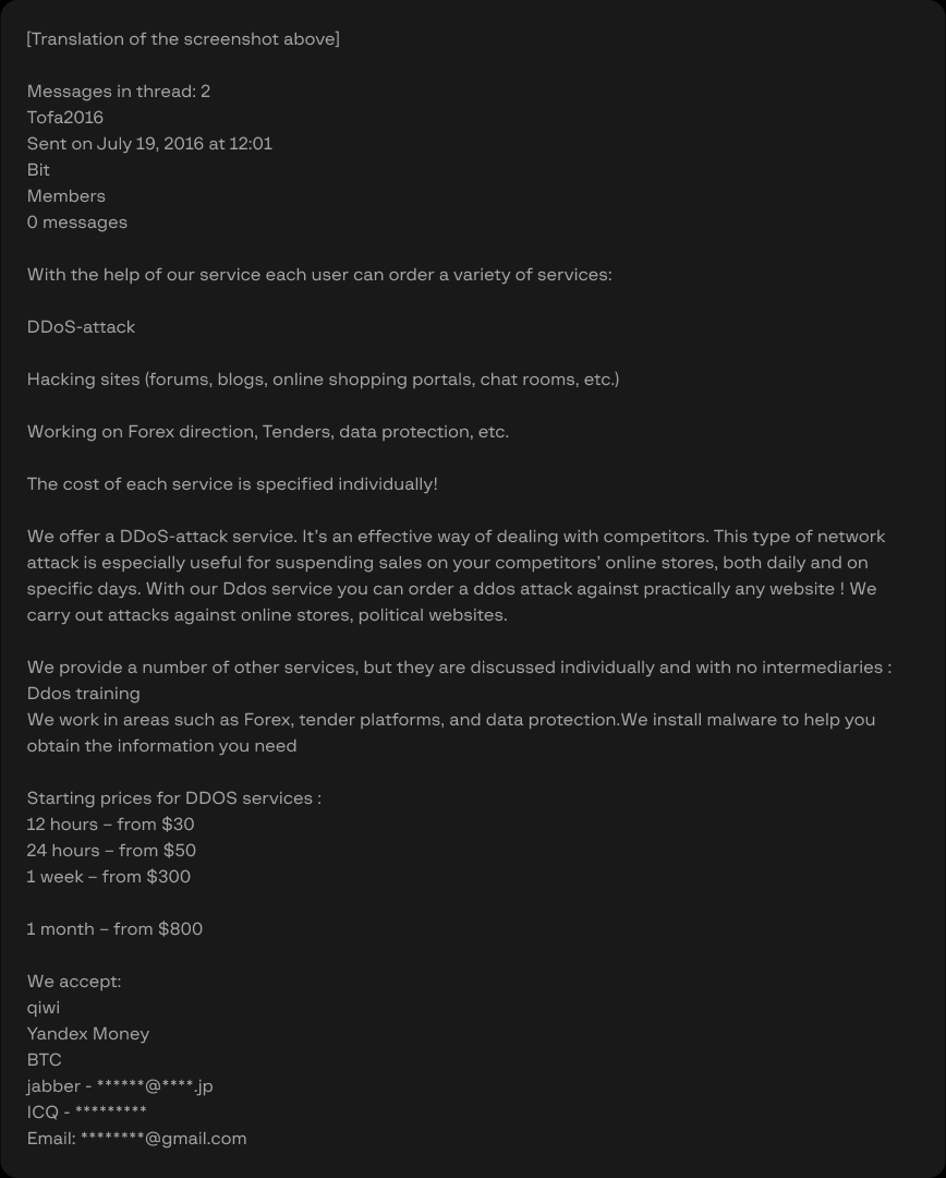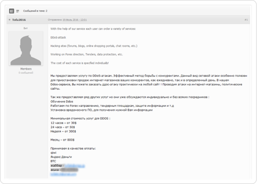 Initially, Group-IB investigators possessed the web server logs of the attack, email addresses and Skype accounts of the attackers. They also shared various payment credentials with the victims. By analyzing this set of data, our specialists were able to identify some accounts on hacking forums associated with the cybercriminals. These accounts were used to advertise DDoS attack services.