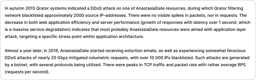 Curiously, one of the attack organizers headed a marriage agency which collaborated with AnastasiaDate throughout 2 years preceding the DDoS attack.